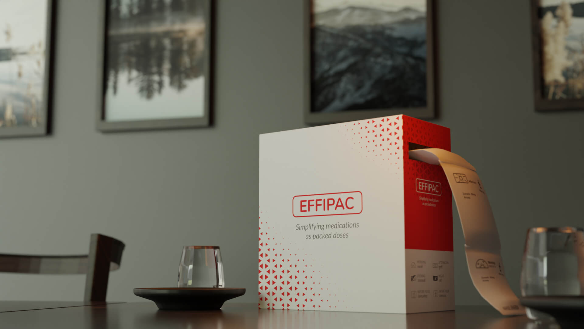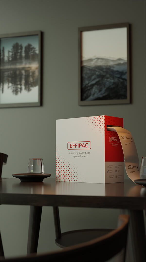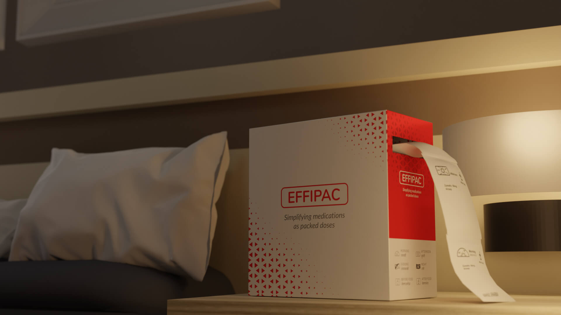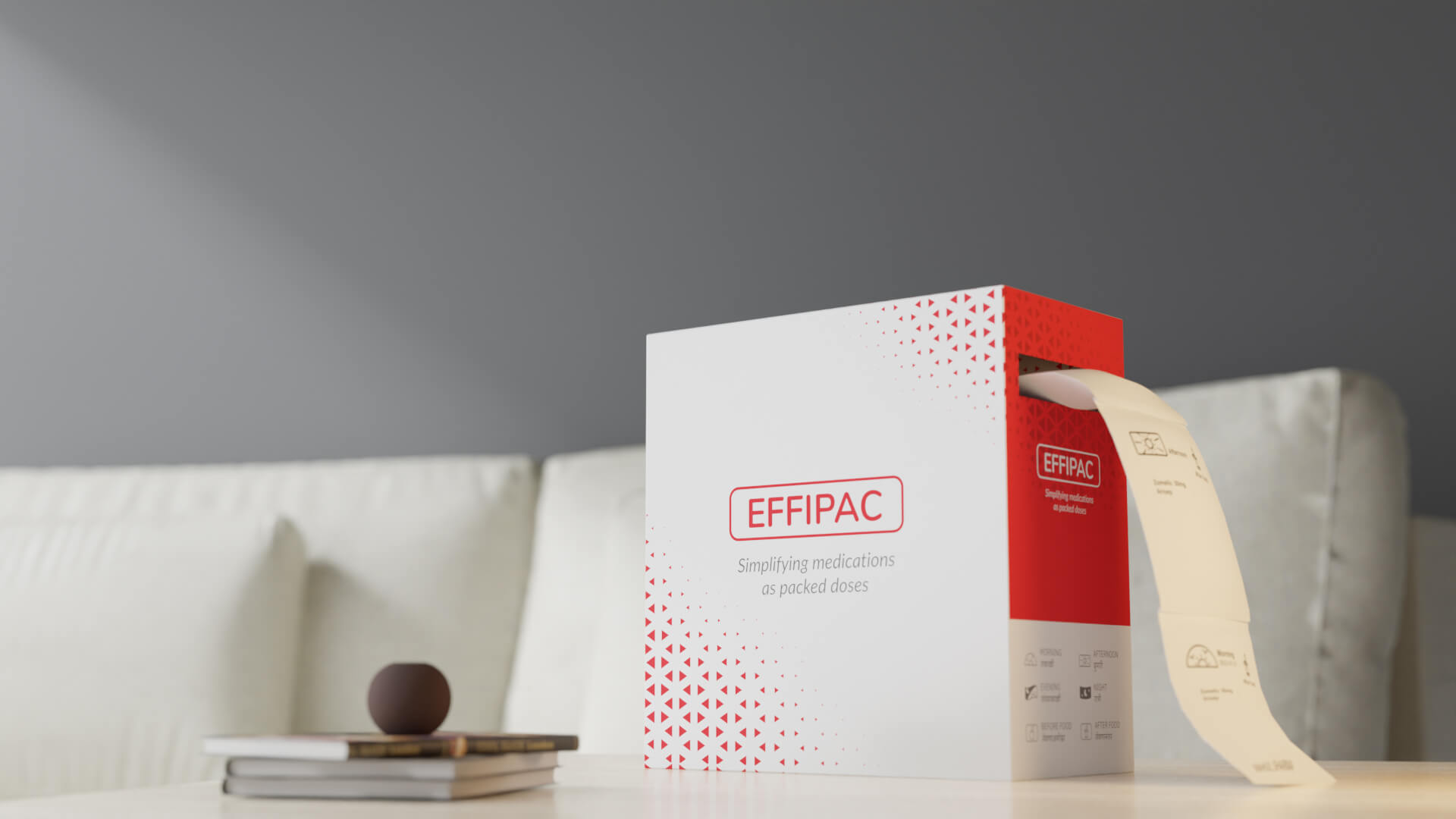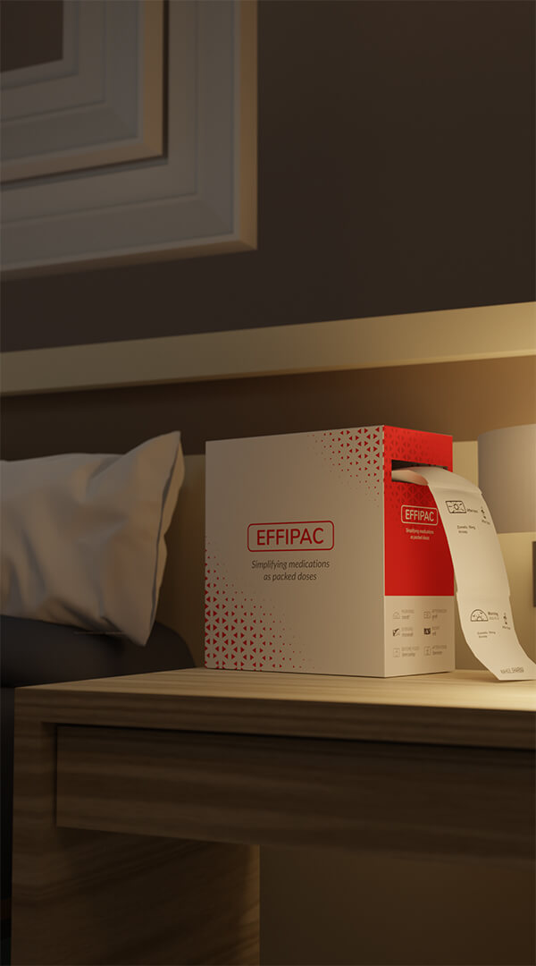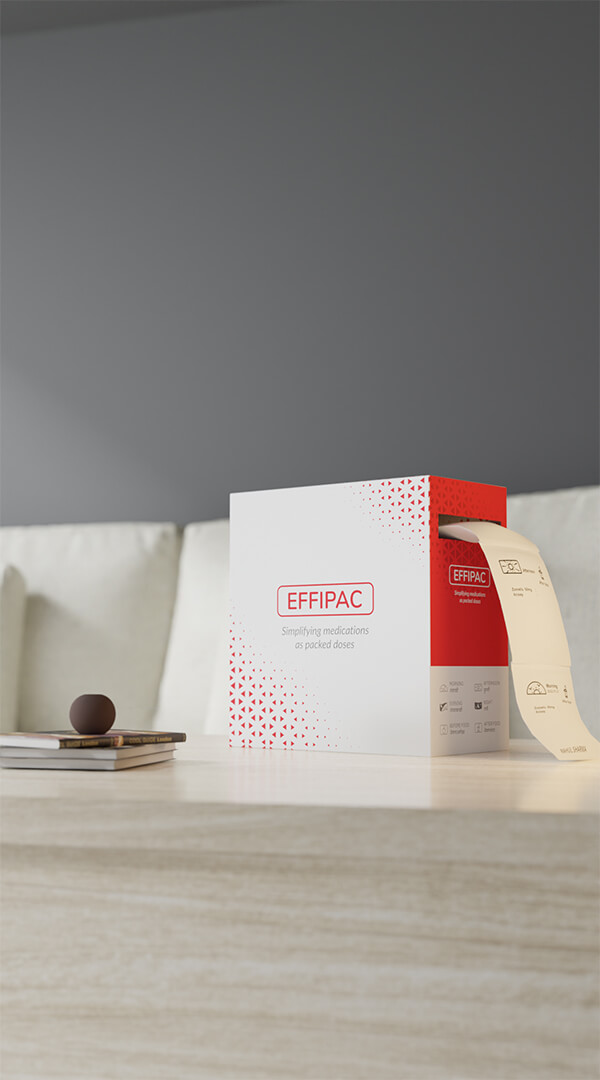EFFIPAC is a system where we buy medicines for the patients as per their prescription, organize them into individual pouches as per the dosage, and deliver them to their doorstep.